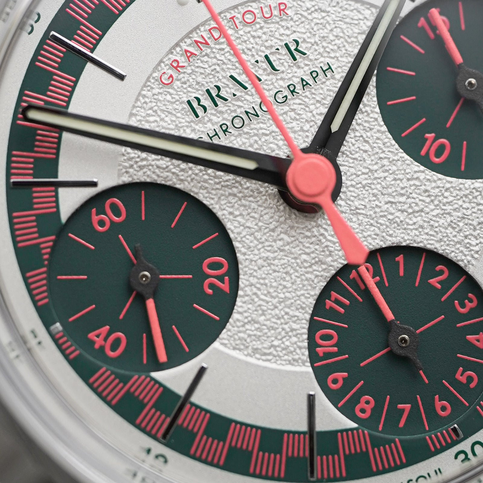 The Grand Tour model features a 38.2 mm stainless steel case, offering a balanced and versatile fit on the wrist. The chronograph layout includes a central 60-second chronograph hand, a 15-minute counter, a 12-hour counter, and running seconds.