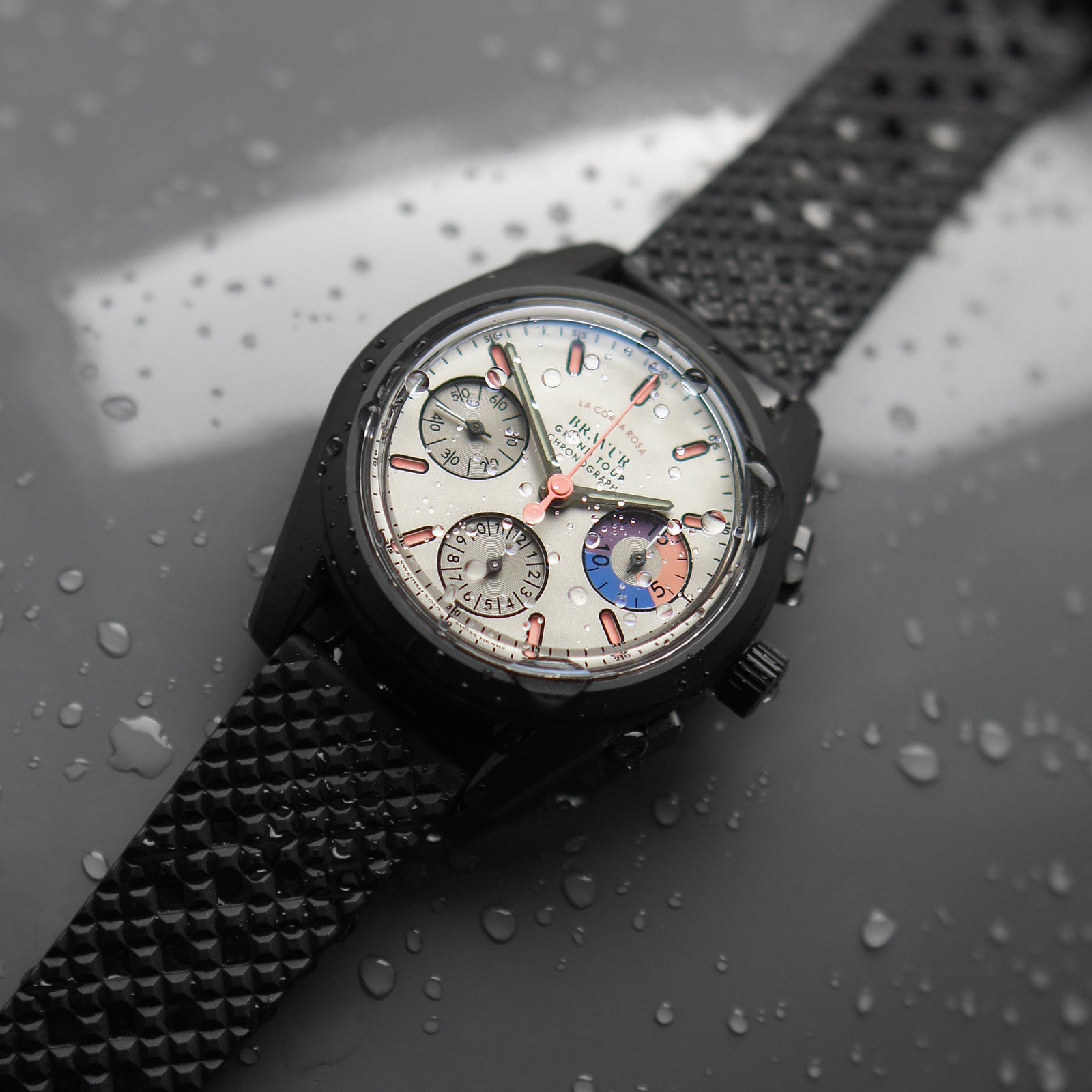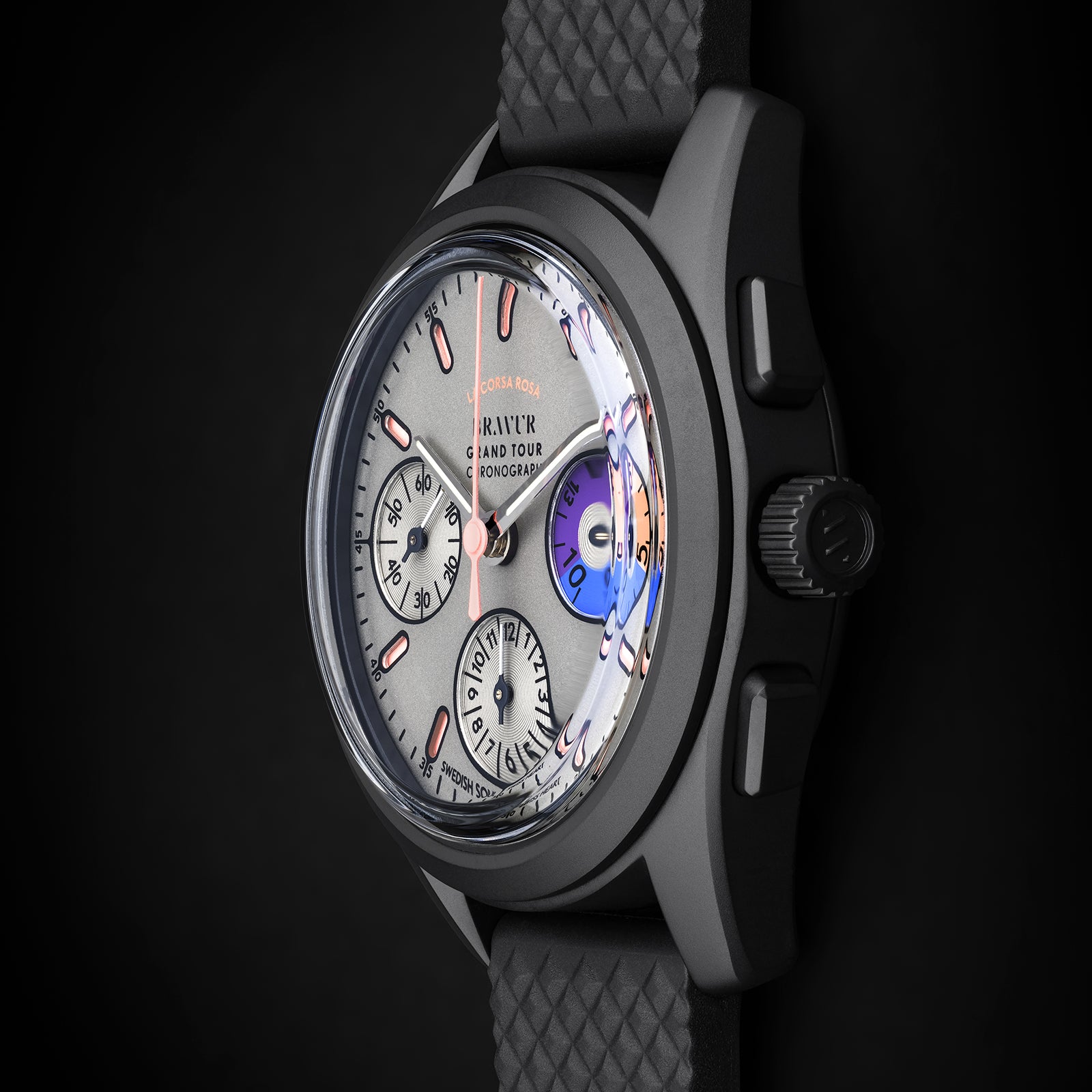 The Grand Tour III model has a case diameter of 38,2 mm, which is a beautiful and versatile size. The case is made from 316L stainless steel and has been treated with a matte black ceramic coating.