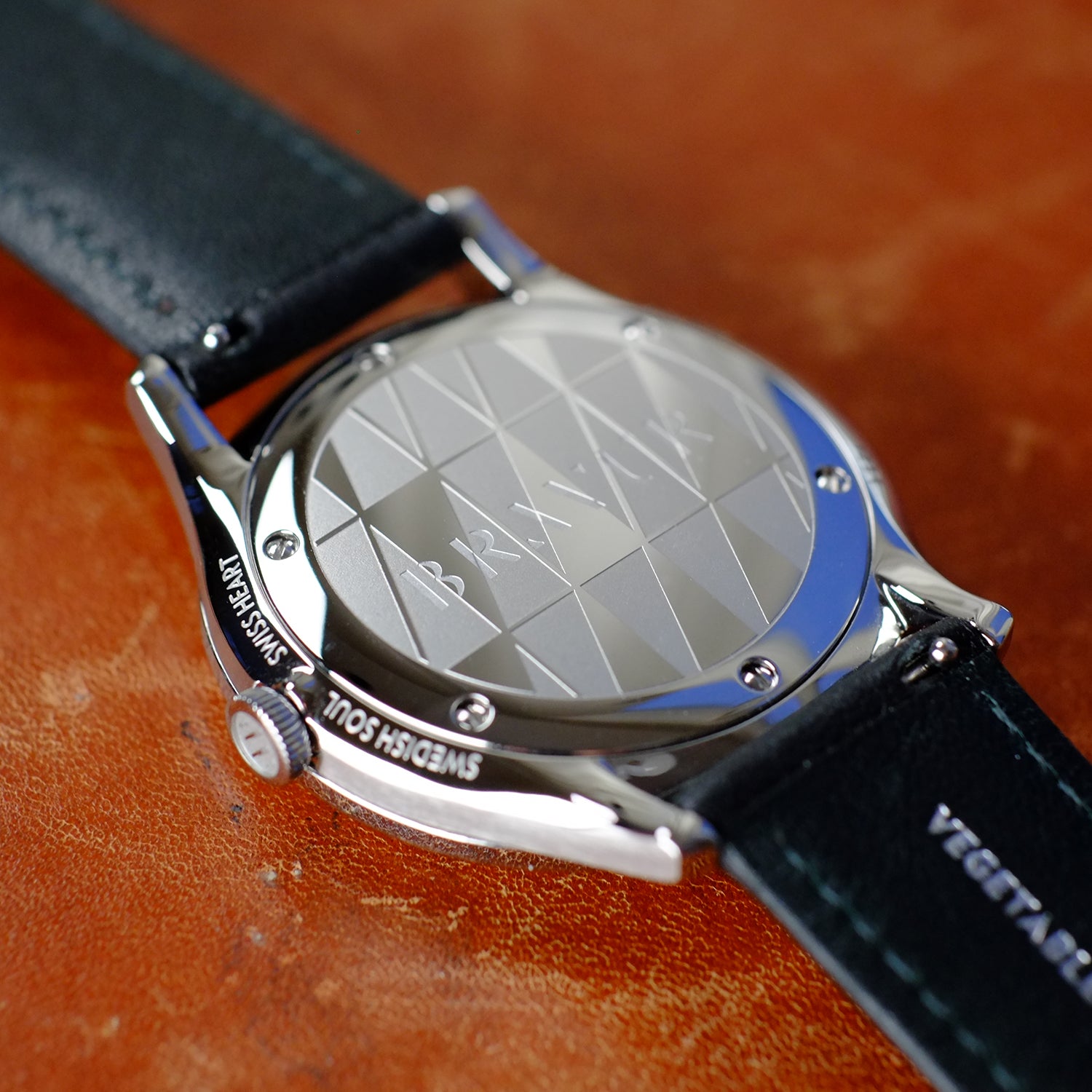 Our Solitär case measures 39 mm and is crafted from Swedish steel, considered being the highest quality steel in the world.