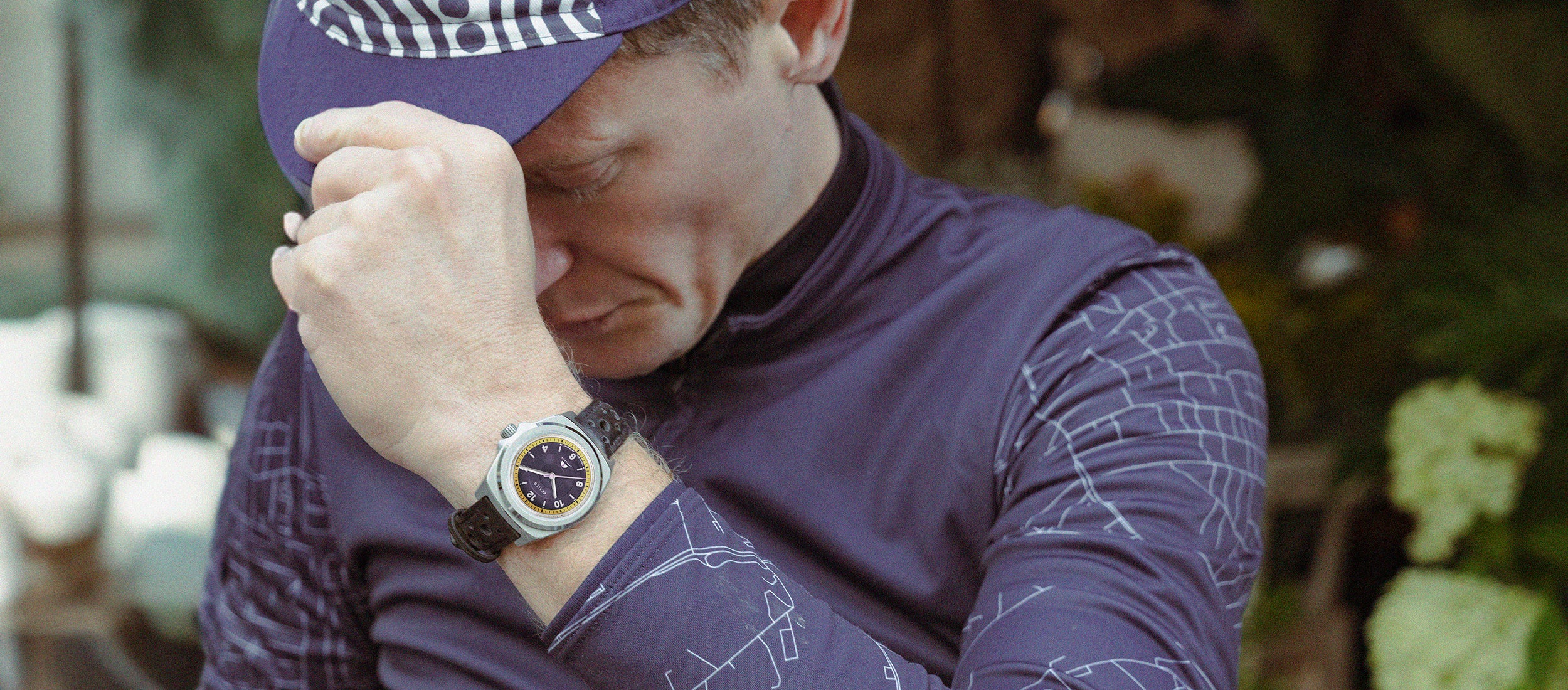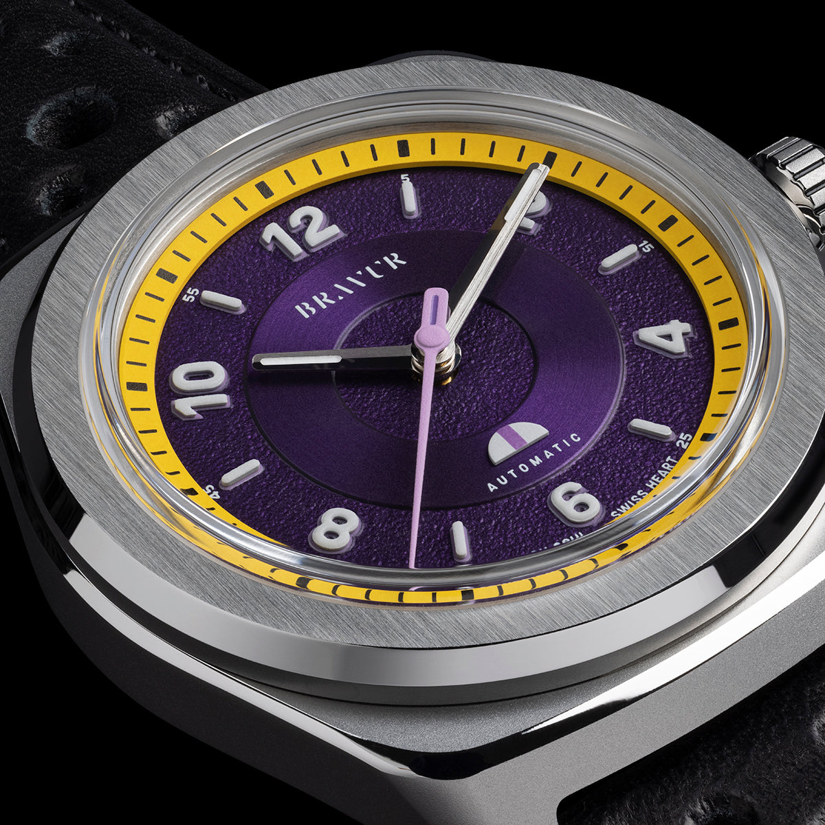 Dial: Purple dial with tarmac texture and sun-ray brush, yellow chapter ring, Super-LumiNova numerals/hour indices. Cycling cap at 6H.