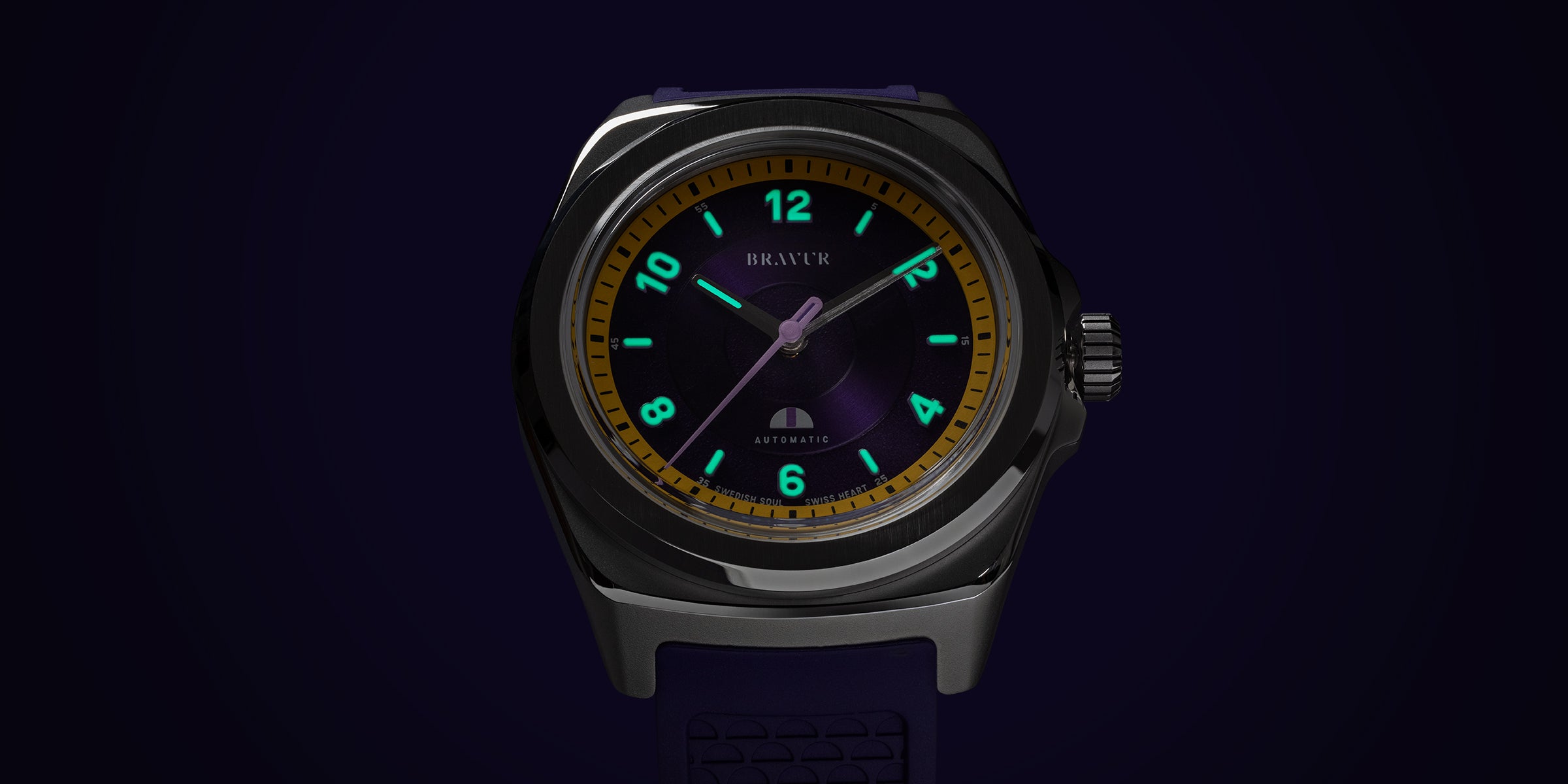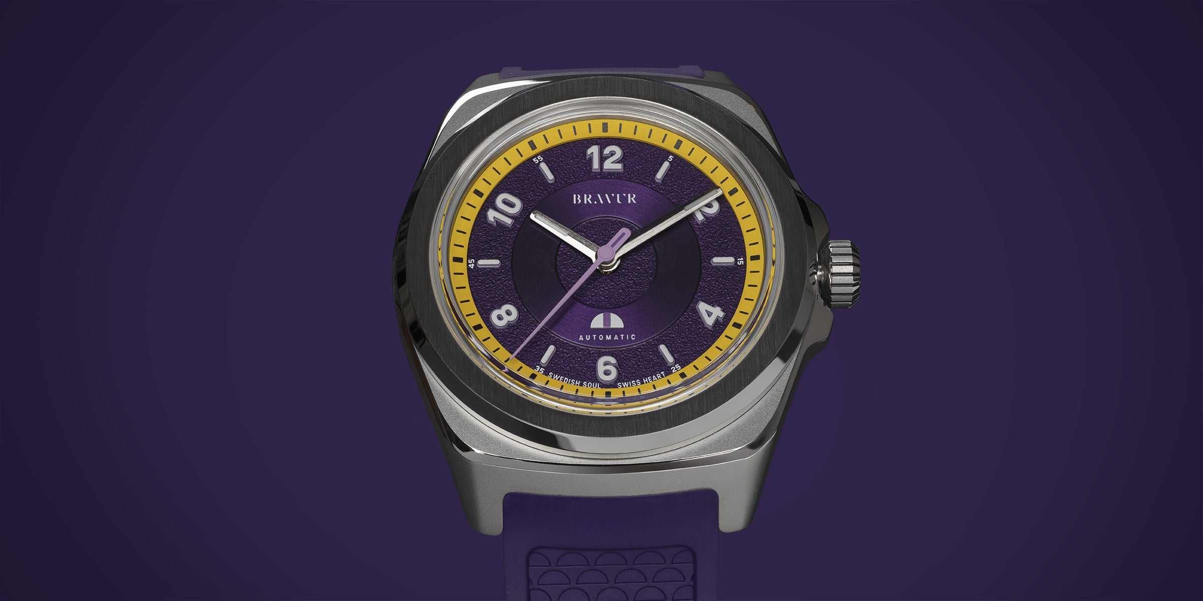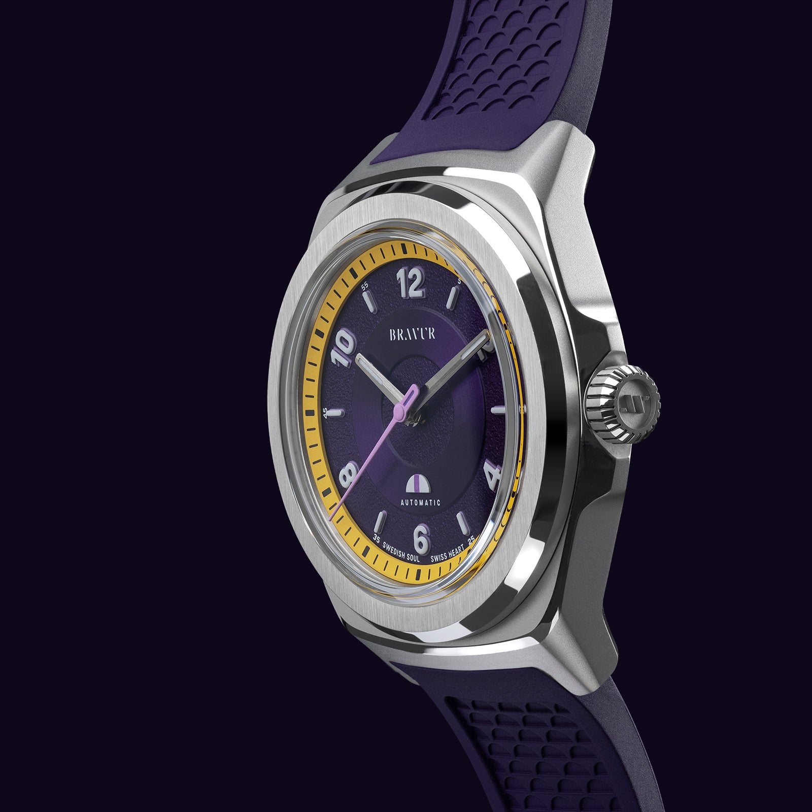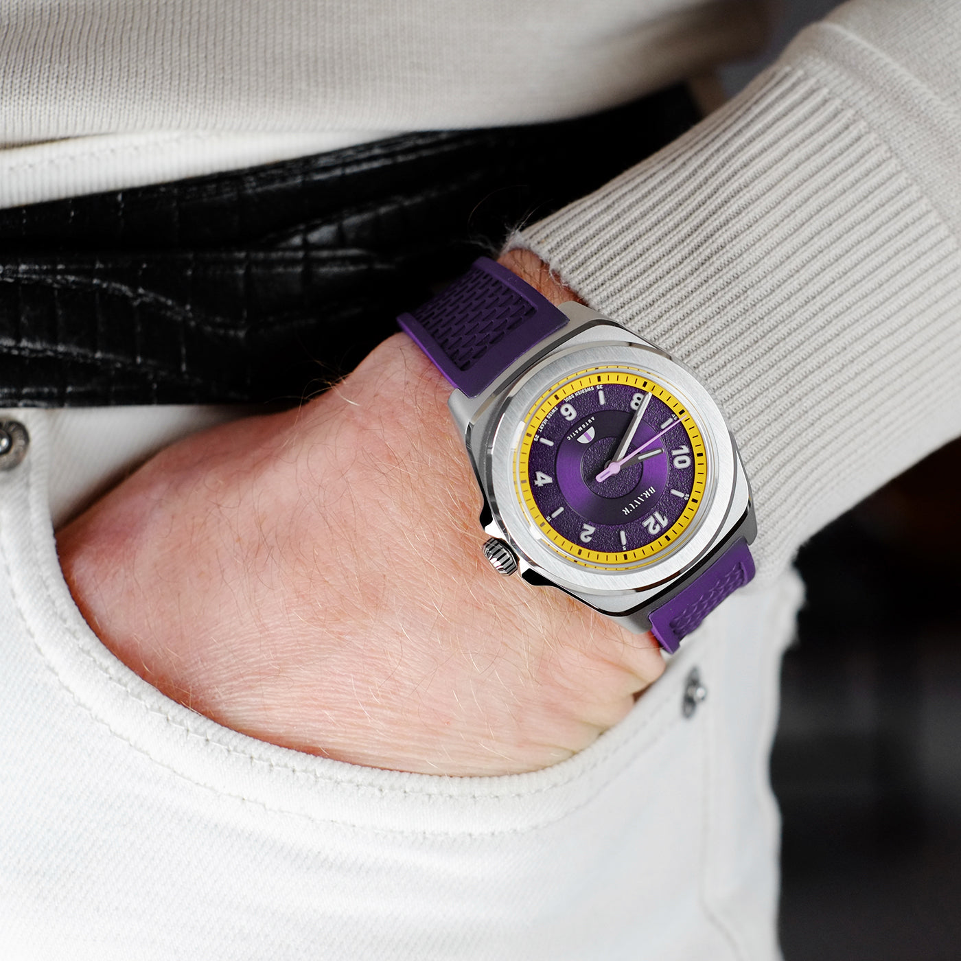 The unique color scheme and the steel casing of the MER bring a complete retro aesthetic. The purple taken from the Mercier classic team kit is reinforced by different surface structures, as a ring with a radial brush is paired with a heavy frosted surface. The yellow accent color, found on the teams’ jersey sleeves and collar, is represented in the chamfered chapter ring. The hour indices are made from a thick Super-LumiNova, making the watch face glow brightly in the dark.