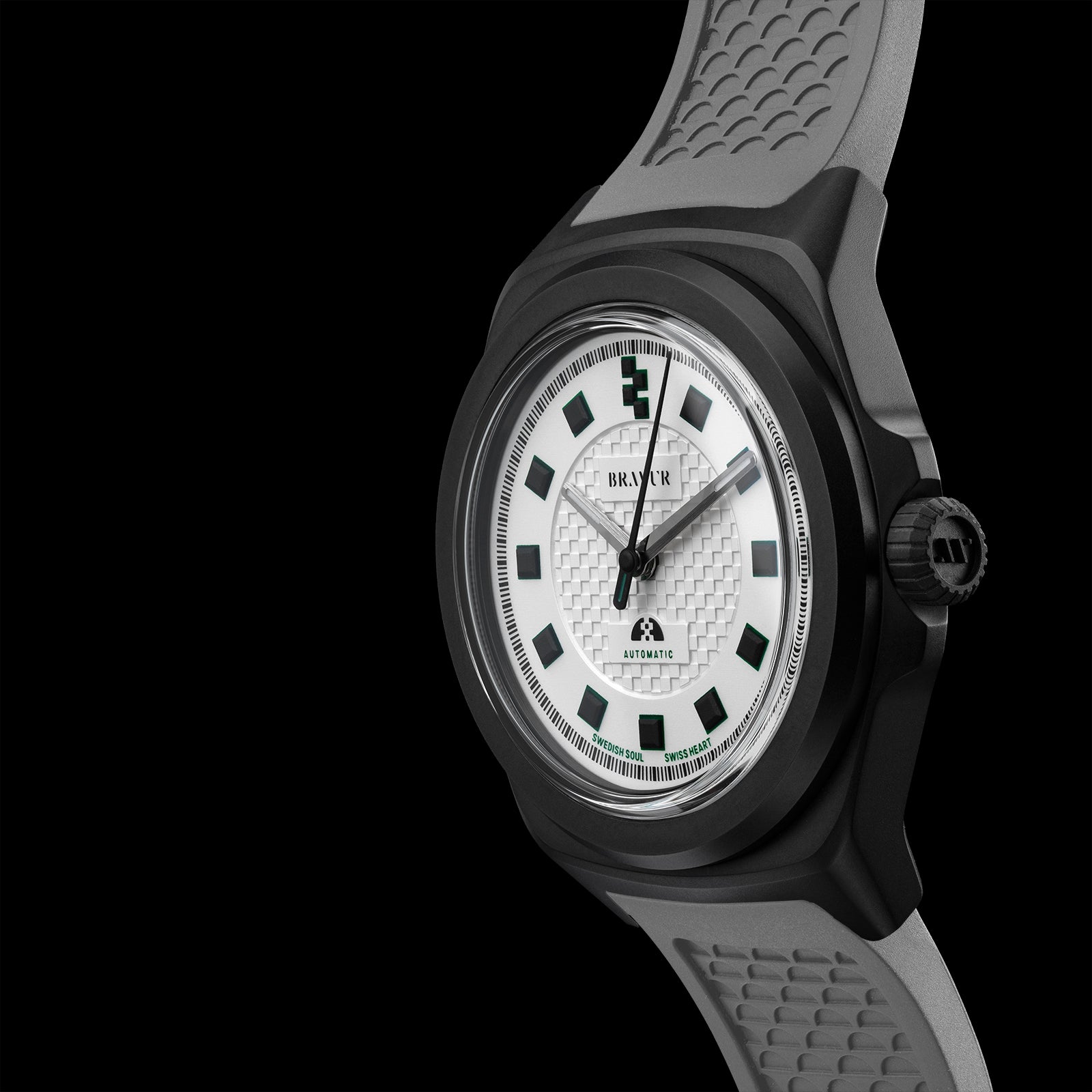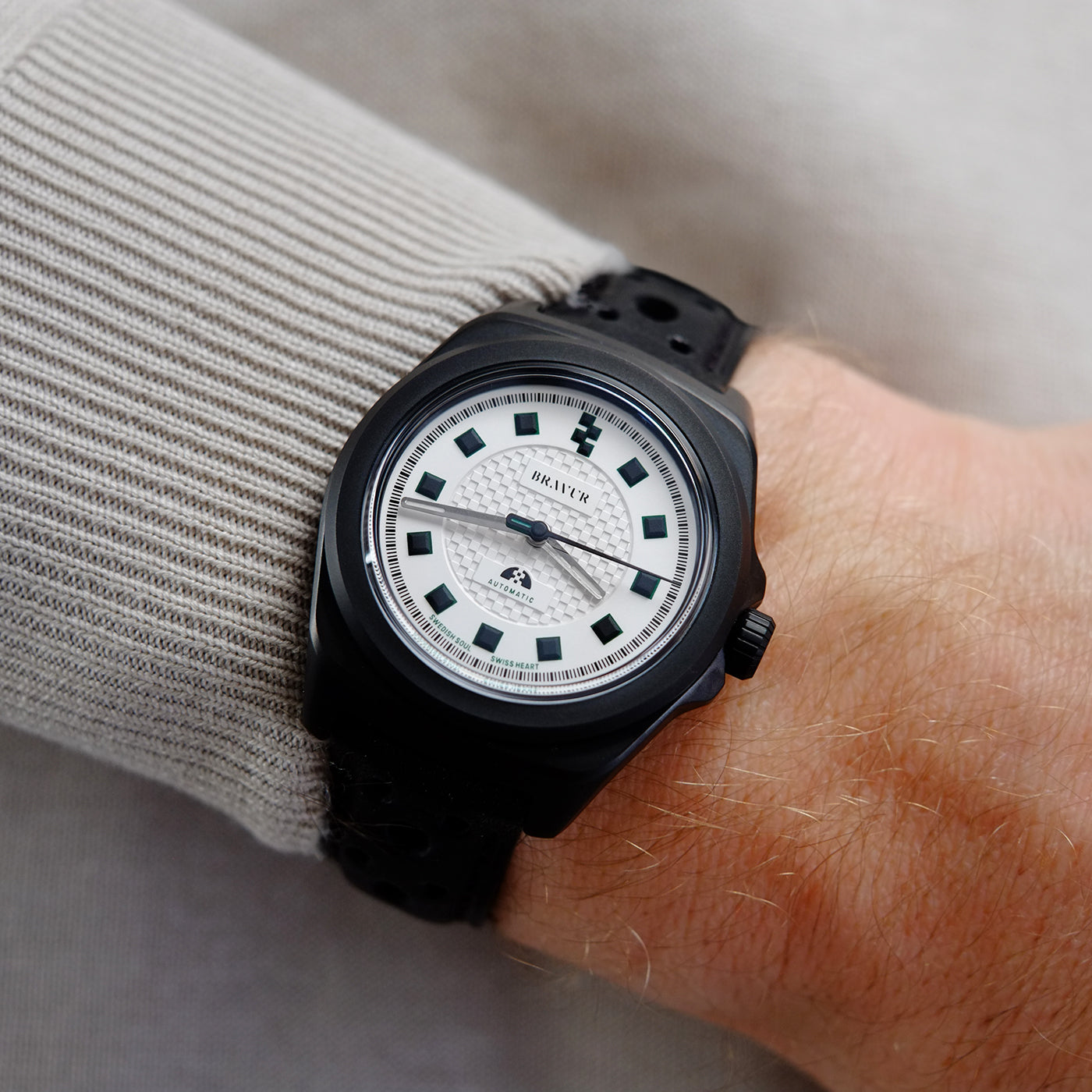 The black squares of the hour indices and the small section of a checker pattern at the 12H index, provide a strong character and maximize legibility when reading the time. The indices stand on a discreet green frame, a nod to the BP logo that appeared on the shoulder of the team jersey between 1956 to 1975. At the center of the dial, an embossed checker pattern plays with shadows and highlights. The PEU is a great all-rounder with a design inspired by a deep racing history.