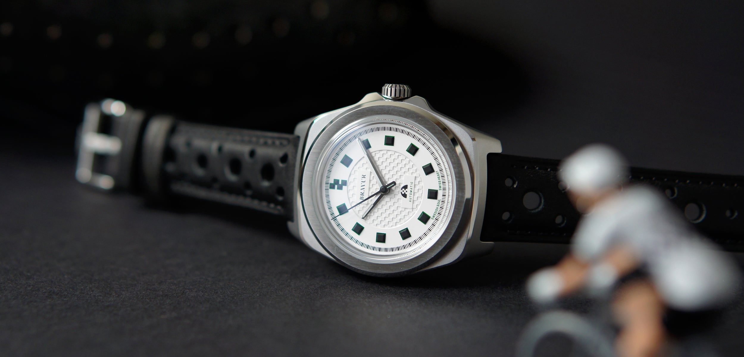 The design of the PEU dial revolves around the team's iconic black-and-white pattern. The black block squares of the hour indices and the small checkered pattern of the 12H index sit on a discreet green frame, a nod to the BP logo featured on the shoulder of the jersey from 1956 to 1975. The indices not only provide a strong character but maximize legibility when reading the time. At the center of the dial is an embossed checkered pattern that plays with shadows and highlights.